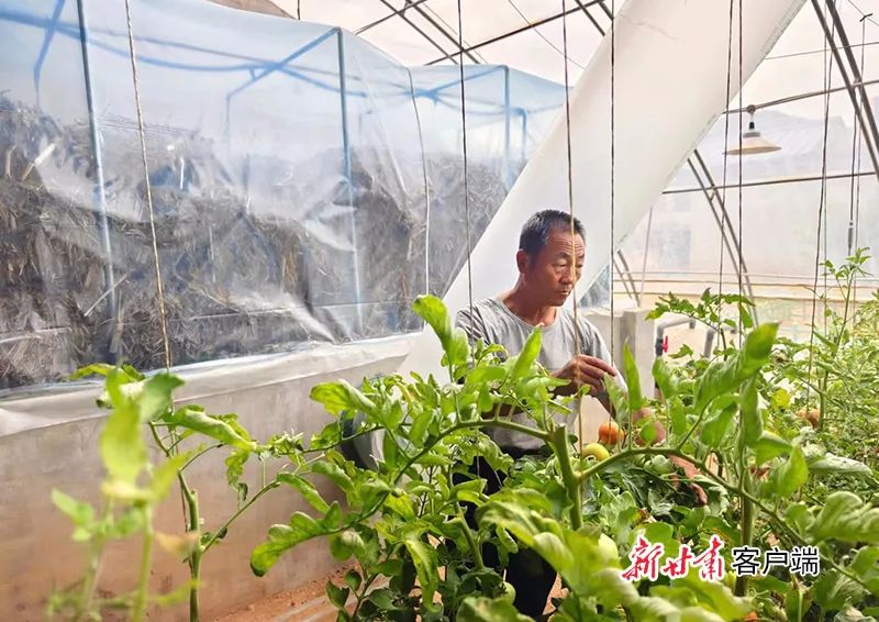 咬克江正在大棚里剪叶、提蔓,他的身后是秸秆生物反应堆。新甘肃·甘肃日报记者 田丽媛