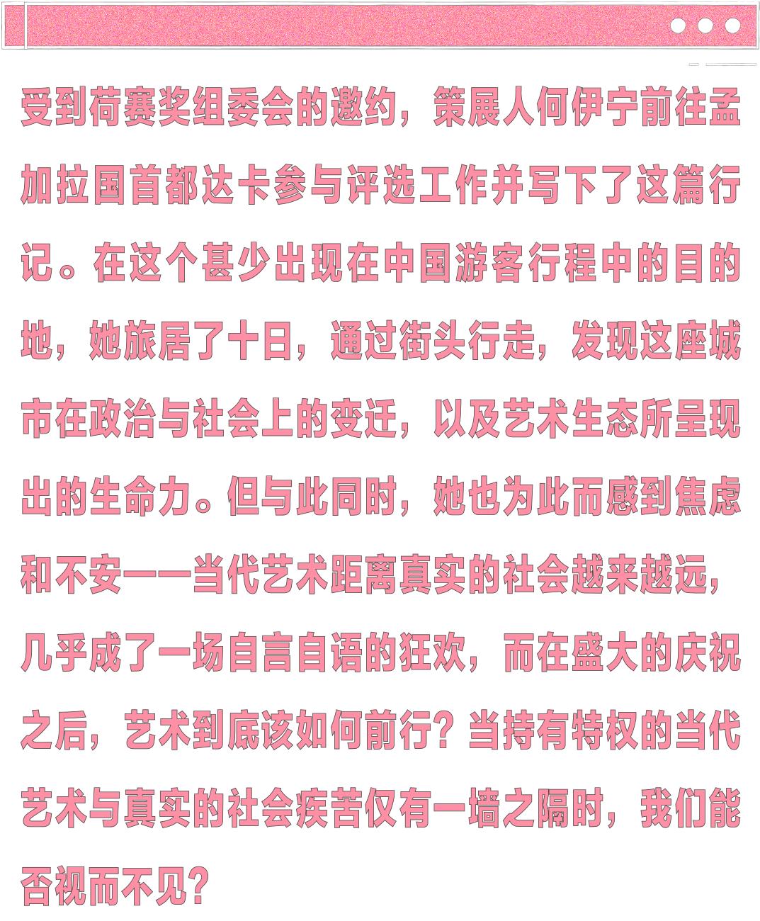 然而,面对喧嚣的达卡艺术峰会,和仅有一墙之隔的疾苦民生之间所展现出的巨大差异,我不禁要问,由政府支持的艺术峰会在特权社会中扮演着怎样的角色?在地艺术实践与西方艺术话语共生背后的权力关系如何?在艺术商业化的趋势下,孟加拉艺术家应如何与之保持批判性距离?