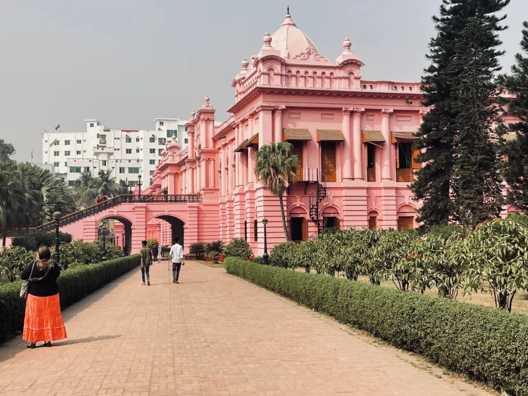 鲁普拉尔大厦老城值得一览的建筑还有阿赫桑·曼济勒(Ahsan Manzil)博物馆,也是一座本土建筑。这座1972年建成的印欧风格的巨型粉色建筑,曾经是孟加拉历史上富裕的穆斯林地主和政治家纳瓦卜·阿卜杜勒·阿卜杜尔·加尼(Nawab Khwaja Abdul Ghani)的住所,如今被列为国家博物馆。顺着参观路线,华丽的楼梯、吊灯、复杂的雕刻,以及令人印象深刻的维多利亚和欧洲家具收藏,展现了阿卜杜尔·加尼家族的富有和权势,也娓娓道出孟加拉国从莫卧儿帝国到英国殖民,再到独立后的故事。