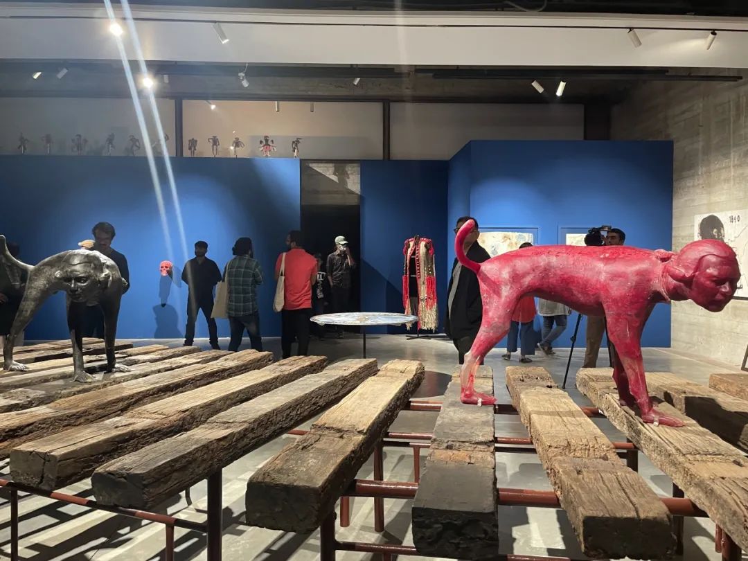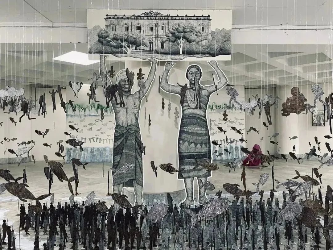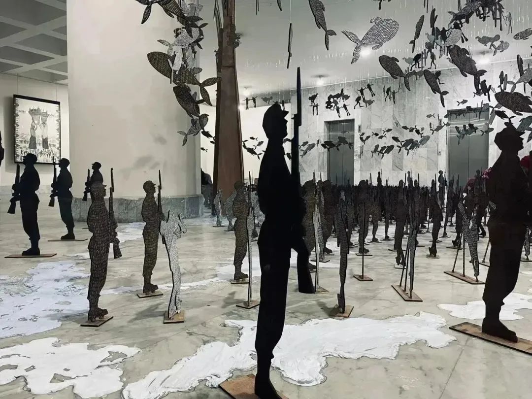 *左右滑动查看达卡艺术峰会现场在美术馆大厅,孟加拉艺术家乔伊德布·罗扎(Joydeb Roaza)的绘画和装置作品,统领着观众的视线——一众迷你纸板小人,仰望着随风游弋的鱼群。小人刻画的是持枪的军队和摄影师的形象,作品试图探讨孟加拉人与若干当代政治话语的关系,例如民族权利、包容性以及拯救自然、土地和文化的冲动等。