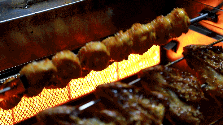 烤鸡腿在炉子里转不停弹嫩的鱿鱼须在铁板上劈啪作响