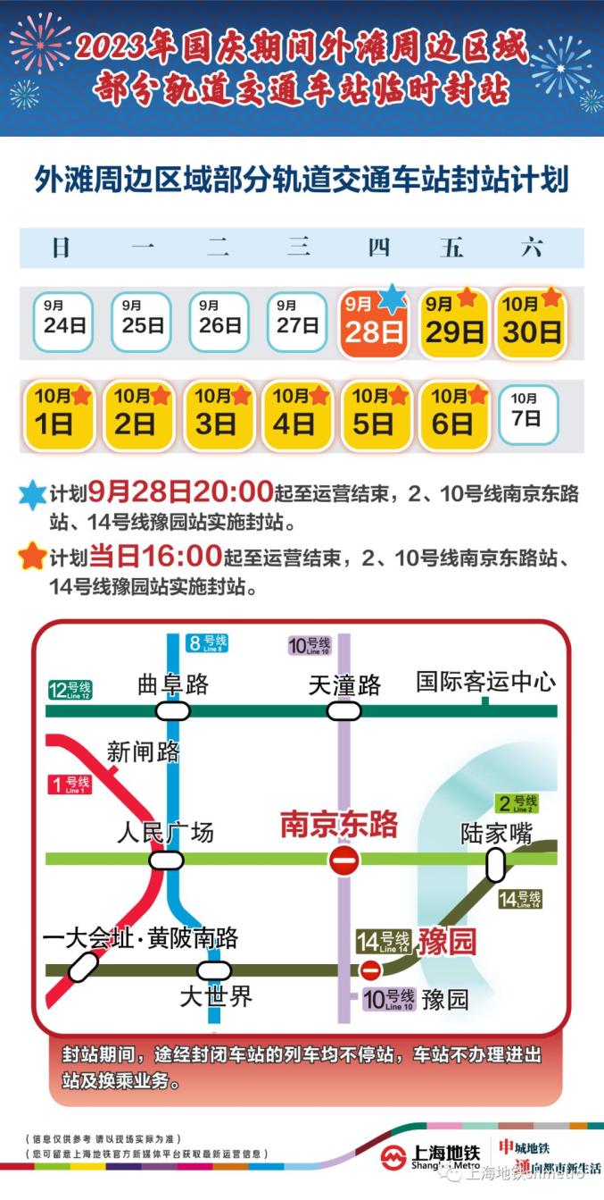 此外,9月28日20:00至运营结束,以及9月29日至10月6日的每日16:00至运营结束,地铁2、10号线南京东路站,14号线豫园站计划实施封站跳停。