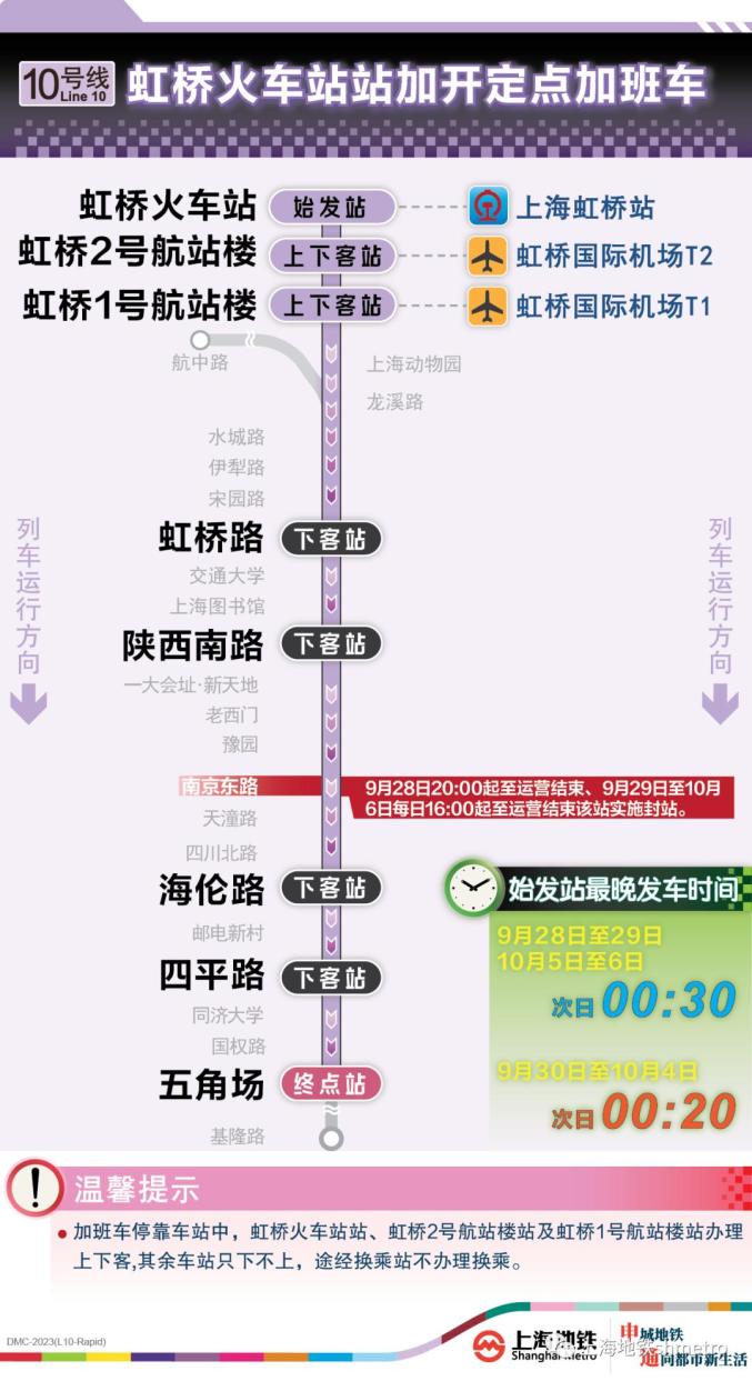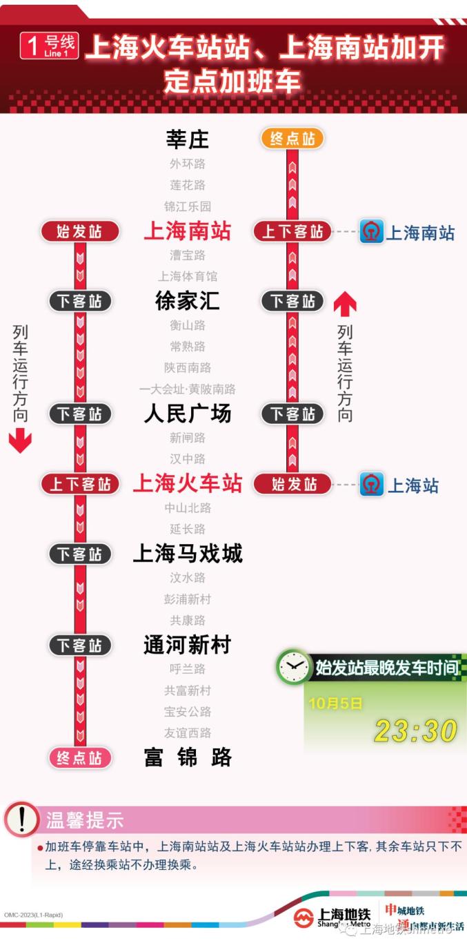 此外为做好节假日返程期间上海火车站、虹桥火车站、上海南站的夜间客流疏散工作,10月5日,地铁1号线在图定基础上实施定点加开方案,加开末班车发车时间至23:30;另10月8日地铁2号线增加定点加班车班次,加开末班车发车时间至次日0:00。
