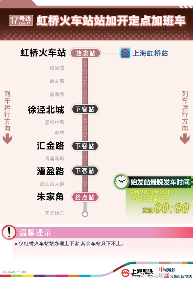根据铁路虹桥站夜间到达列车开行情况,9月28日、9月29日、10月5日、10月6日,铁路在原夜间图定计划的基础上增加了开行班次。为应对铁路临时加开,做好虹桥火车站夜间列车集中到达大客流疏散工作,虹桥枢纽相关的地铁2、10、17号线在既定延时或加开方案的基础上进一步增开定点加班车。其中,9月28日至29日、10月5日至6日夜间,虹桥火车站定点加班车最晚发车时刻为:2号线至次日2:00、10号线至次日0:30、17号线至次日0:00。同时,9月30日至10月4日,2号线和10号线虹桥火车站定点加班车发车时刻推迟至次日0:20。