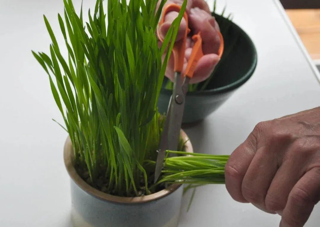 小麦苗长到一定高度后,就可以进行收割,用剪刀剪下小麦苗的茎叶,留下一些根部,可以再次发芽,循环利用。小麦苗可以用来做沙拉、汤或果汁,富含营养。若想收获小麦穗,则需继续养护,提供更加充足的光照与养分。当小麦抽穗时可以适当减少浇水量,当穗成熟时,可以逐渐停止浇水,直到麦穗变为金黄色,就可以收割了。