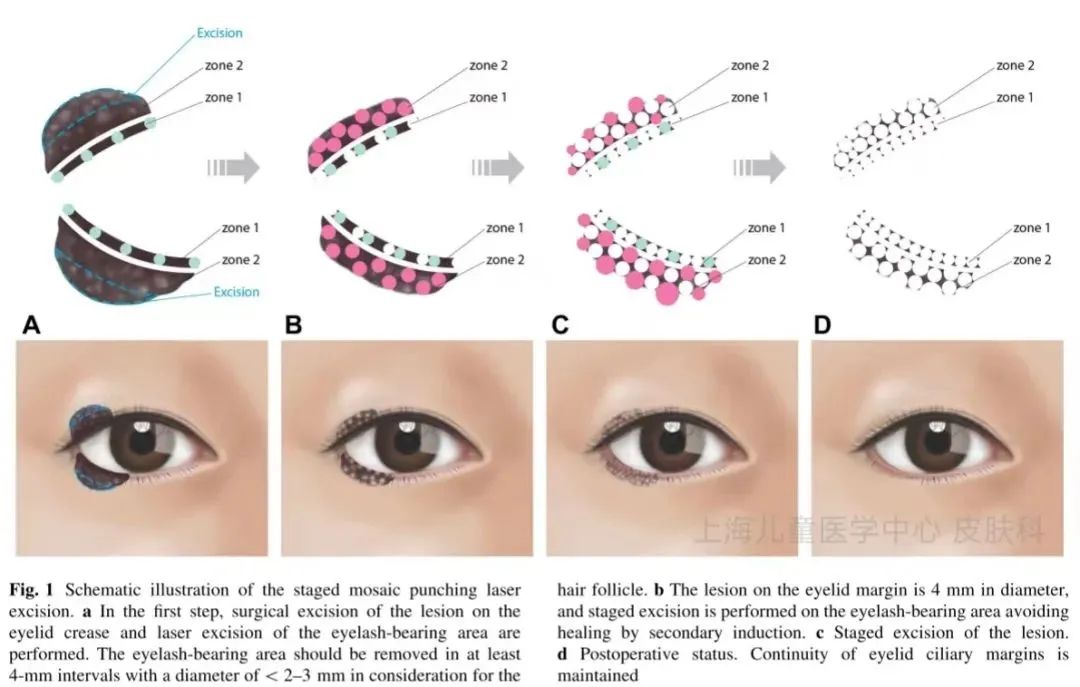 痣长在眼睑上,还上下睑都有,可想而知这有多难处理,最常采用的手术方式通常是邻近皮瓣的转移修复(如图4),现在尚有一种新的分期环钻手术的办法,相对损伤小,后期美观度高,但需要多次进行(如图5)。