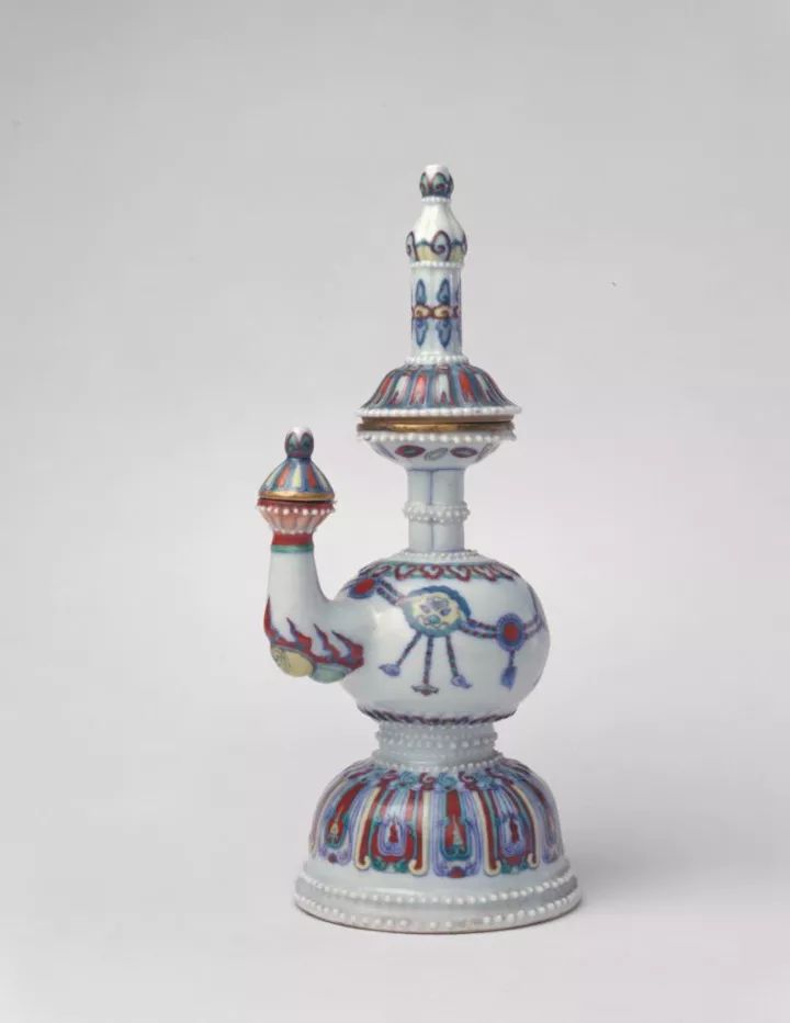瓷质的贲巴壶由金属质地的器形发展而来,清代康熙、乾隆时期烧造较多。御窑厂烧造的那些用来赏赐西藏、青海等地区的宗教领袖再好不过了。