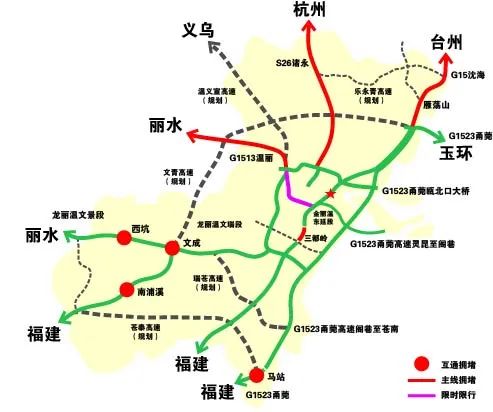 预计诸永高速全线、温丽高速温州方向、三都岭隧道段流量较大,尽量提前绕行。受重点景区影响,雁荡山进口(雁荡山)、西坑进口(百丈漈)、南浦溪进口(南浦溪)、马站进口(渔寮)拥堵程度较高,可能出现潮汐式拥堵。