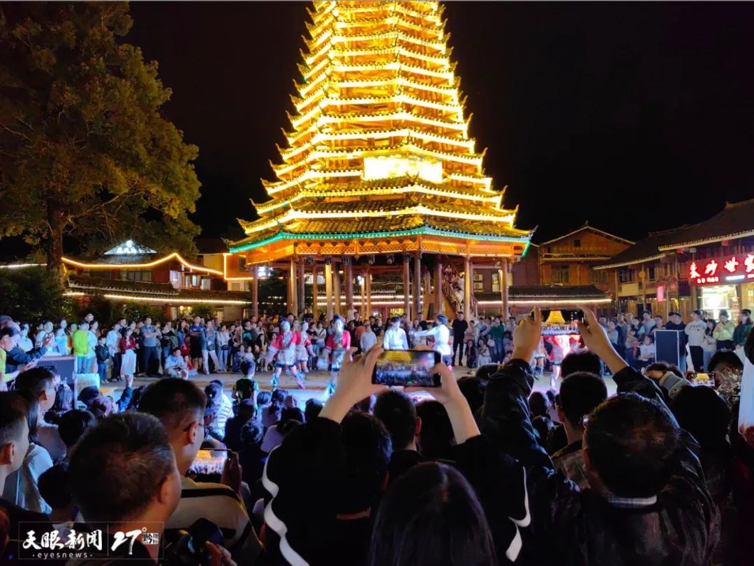 游客在寨沙侗寨观看侗族原生态歌舞表演来自湖南的刘静与家人一起观看了当晚的文艺表演、体验了篝火晚会,玩得很开心,对寨沙侗寨的旅游服务大加赞赏,“这里的乡村旅游很有意思。”