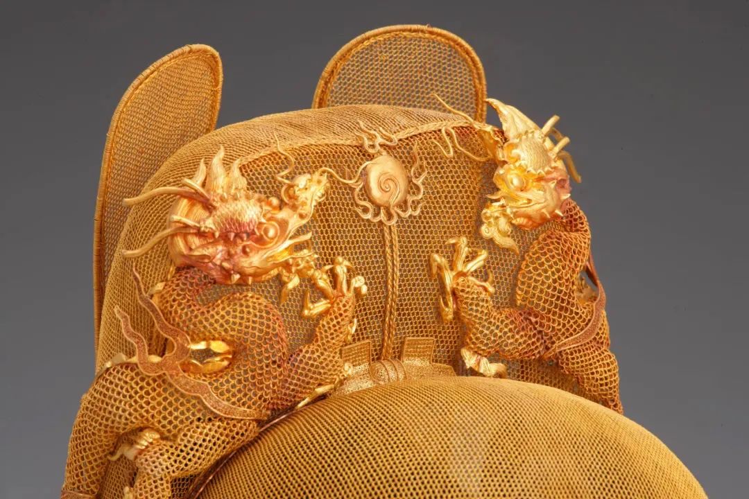 明代艺人用极细的金丝编织成的万历皇帝金冠,冠身薄如轻纱,空隙均匀,金冠上端有龙戏珠图案,造型讲究,堪称一代杰作。
