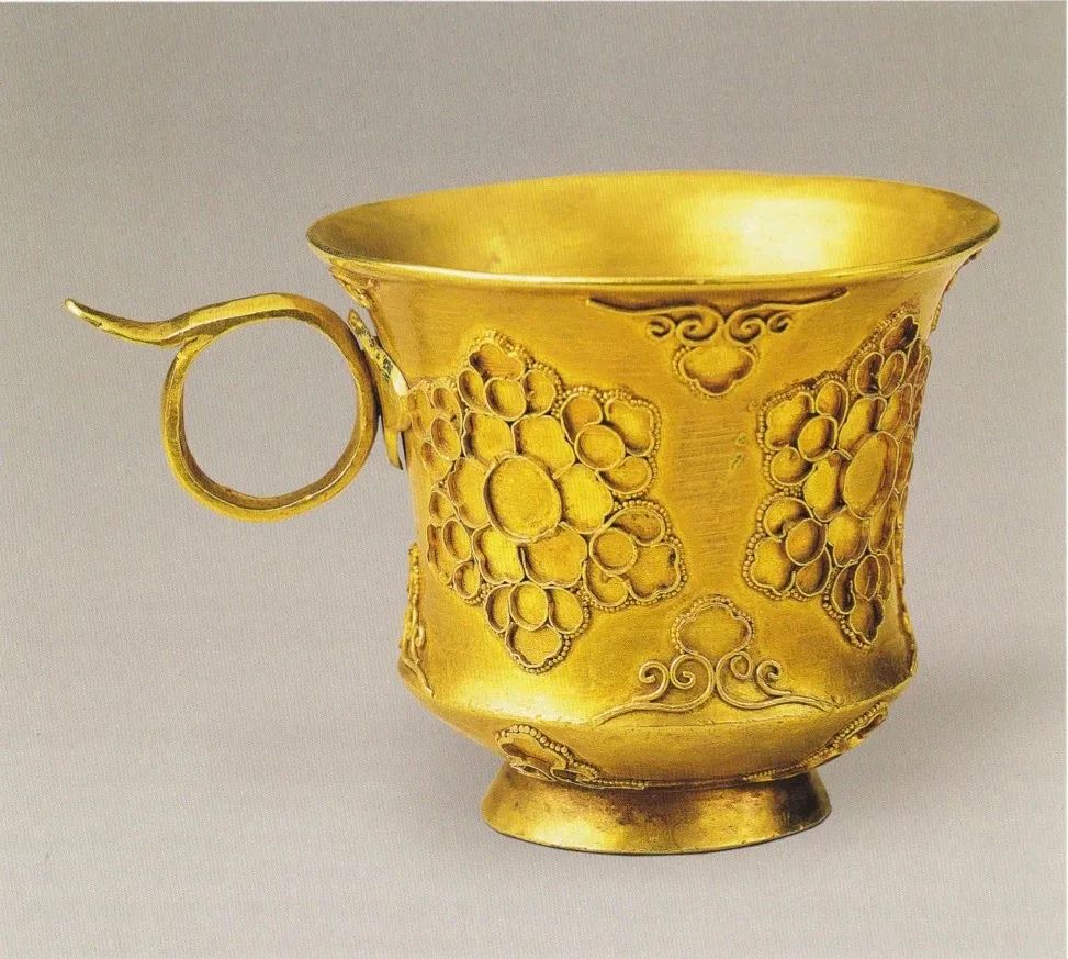 金筐宝钿团花纹金杯所谓“花丝万缕织金冠,妙手镶嵌有乾坤”,正是对这项精妙工艺的高度概括。