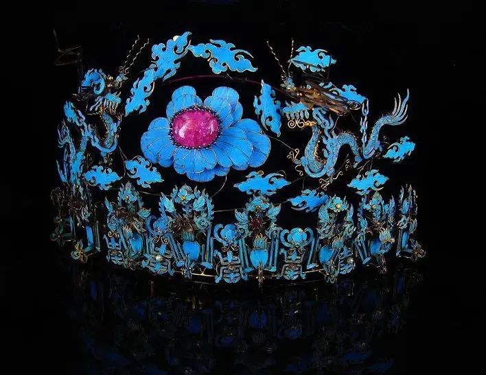 孝端九龙九凤冠孝端九龙九凤冠更加华丽,镶嵌了百余粒未经加工的天然红宝石,以及珍珠5000余颗。