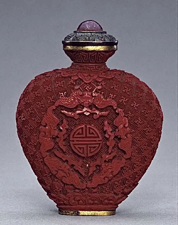 红雕漆“五蝠捧寿”鼻烟壶这件旧藏的清乾隆黄色缂丝云蝠寿袷袍,应该是乾隆时期皇太后或皇后于寿诞庆贺之时穿用的吉服袍。