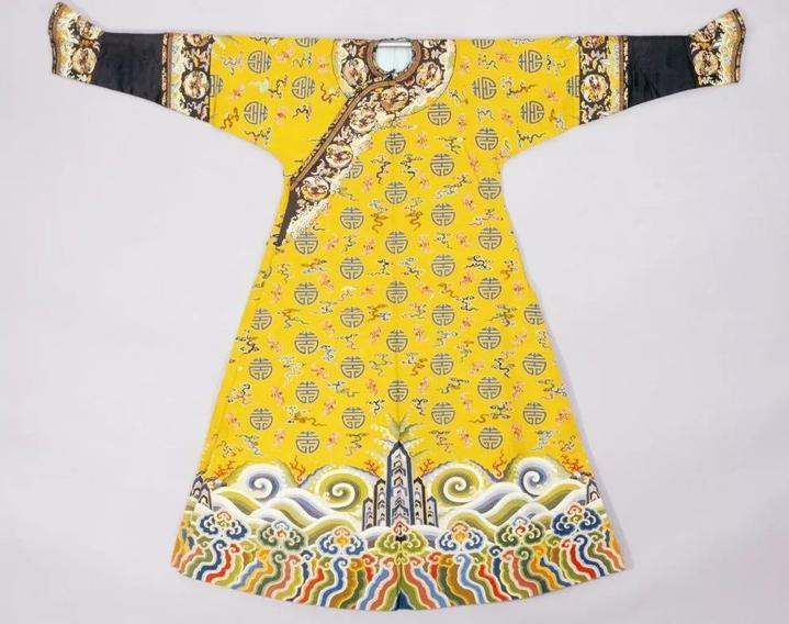 它以黄色缂丝为地,通身织有约一百个团寿字和近100只红色的蝙蝠,间饰五彩流云,寓含“洪福齐天”“长寿百岁”的吉祥意义。