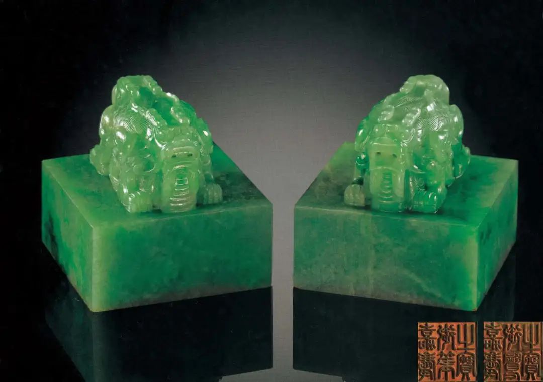 在清代宫廷里,有一方御宝交龙钮翡翠玉玺。印玺所采用的翡翠,透亮雅致,柔润温和,盘龙的须发和鳞甲都精致十足,栩栩如生。