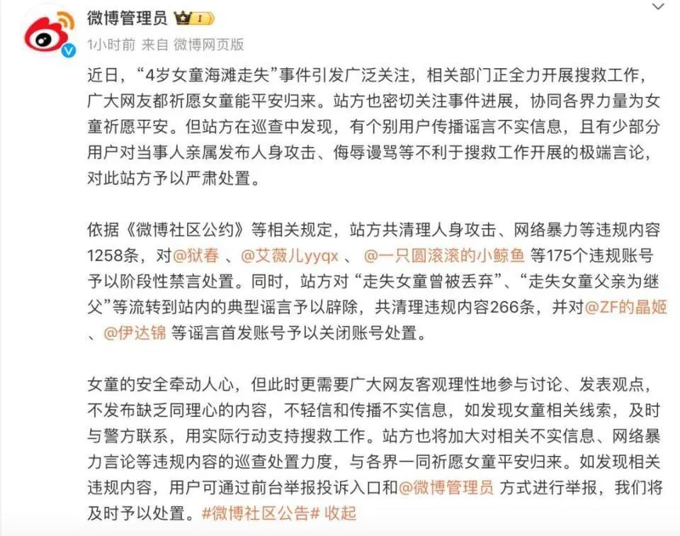 同时,站方对 “走失女童曾被丢弃”、“走失女童父亲为继父”等流转到站内的典型谣言予以辟除,共清理违规内容266条,并对@ZF的晶姬 、@伊达锦 等谣言首发账号予以关闭账号处置。