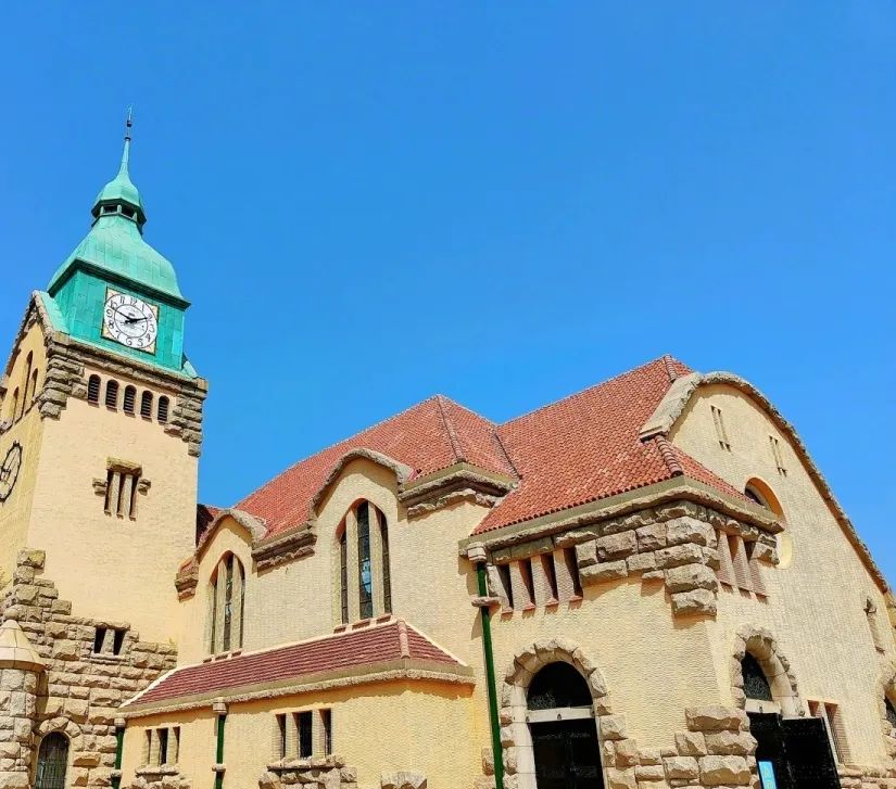 在江苏路上缓步前行,能够看到一座古堡式建筑——青岛基督教堂,坚固厚重的黄色墙壁、陡斜的红色屋顶、绿色尖顶的钟楼,使整个教堂尽显精致典雅。