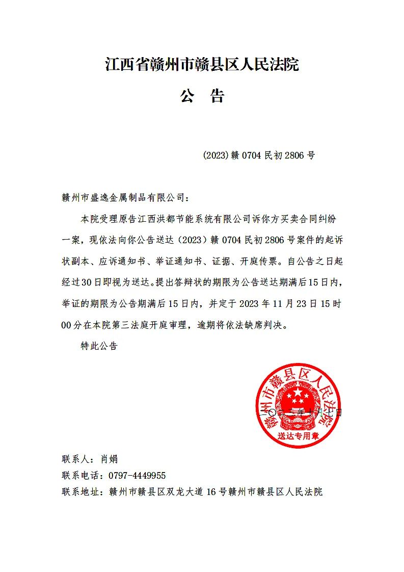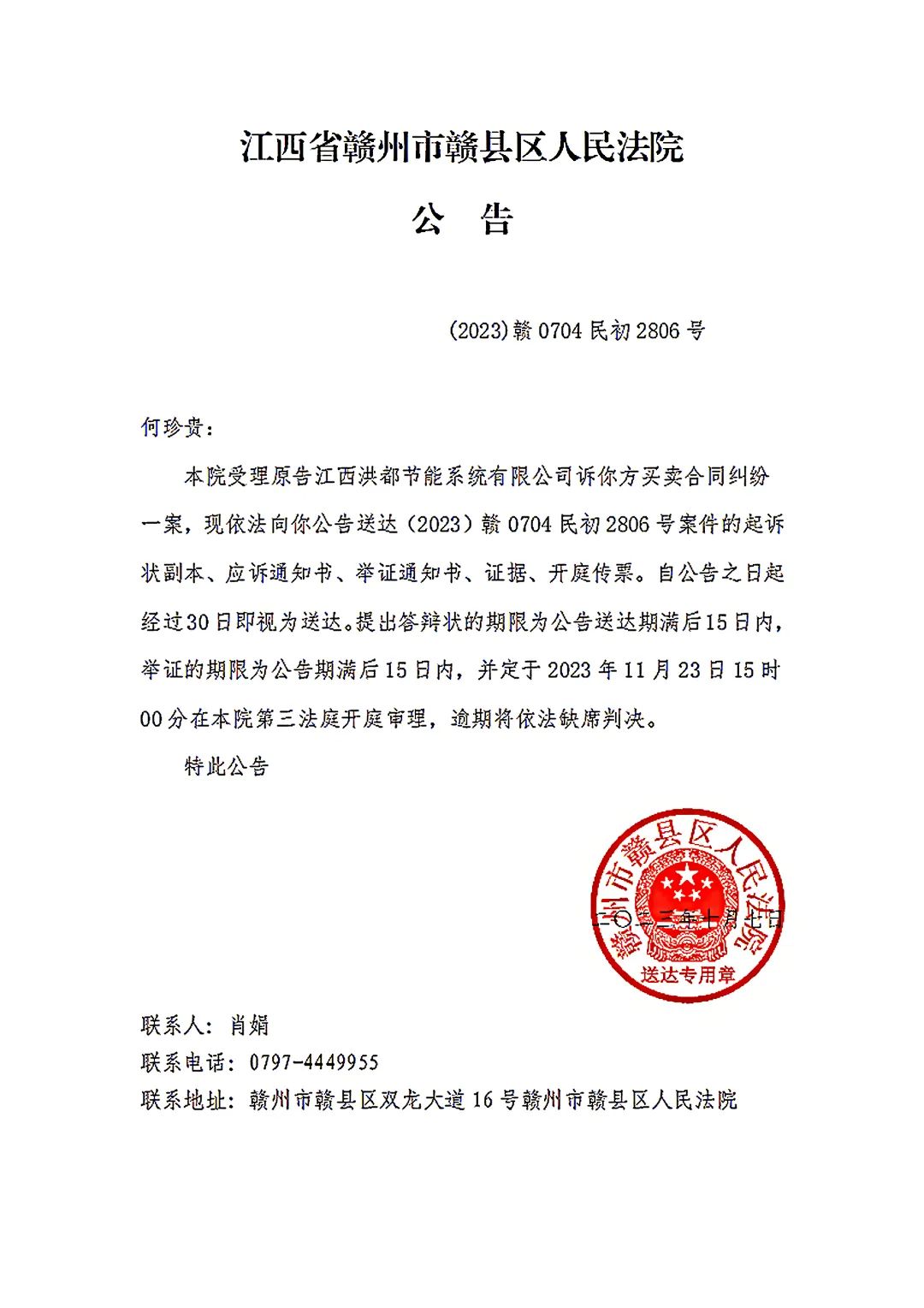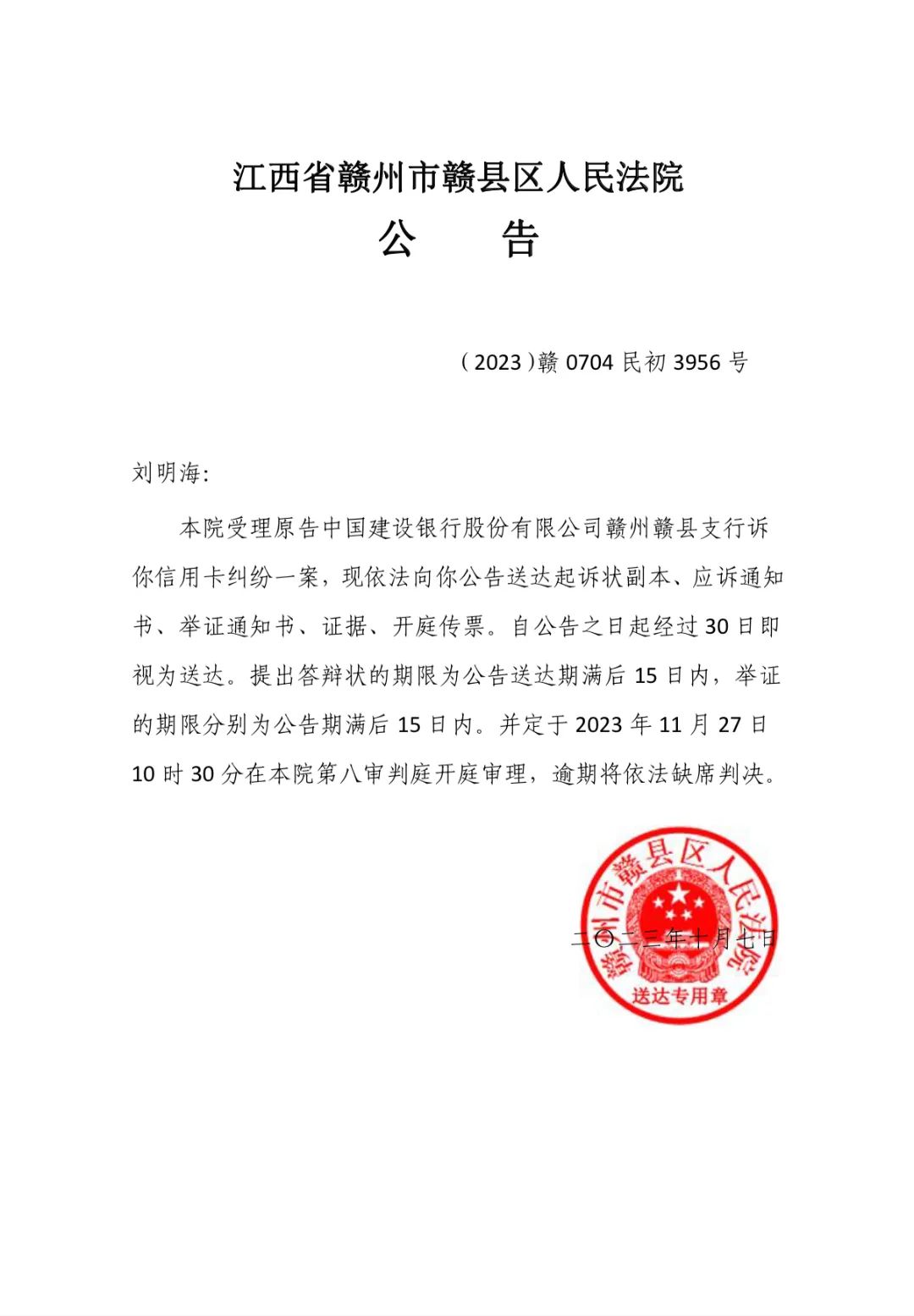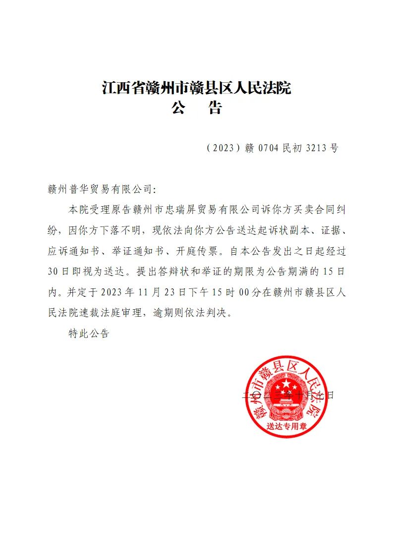 赣县区法院对涉案的下落不明的受送达人,将依法采取网络公告方式送达诉讼文书,即通过司法送达网(http://www.sifasongda.com/)刊登公告等方式公告开庭信息,现将公告送达相关法律文书公示如下: