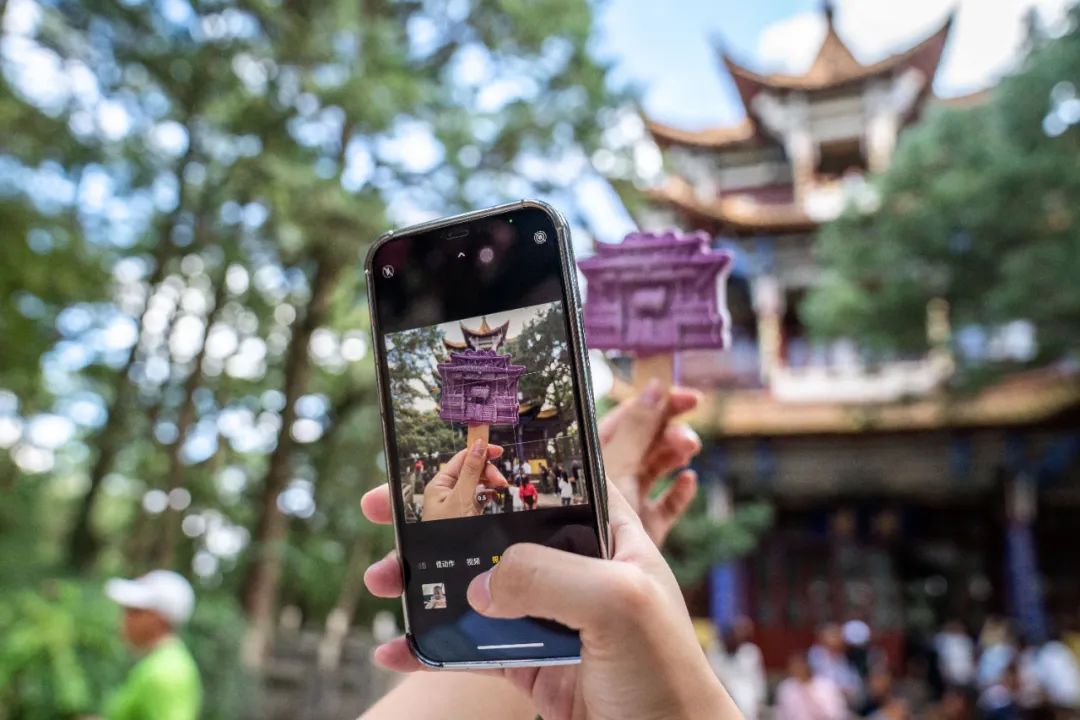 游客在昆明市金殿风景名胜区拍摄文创雪糕。