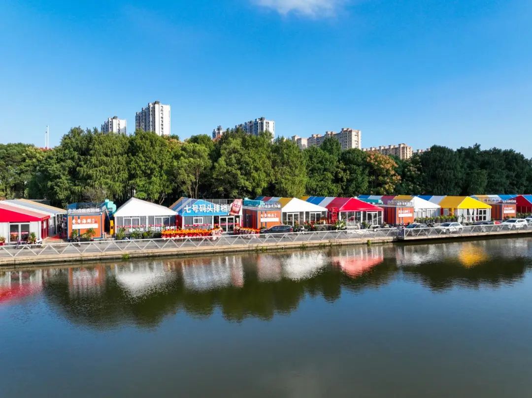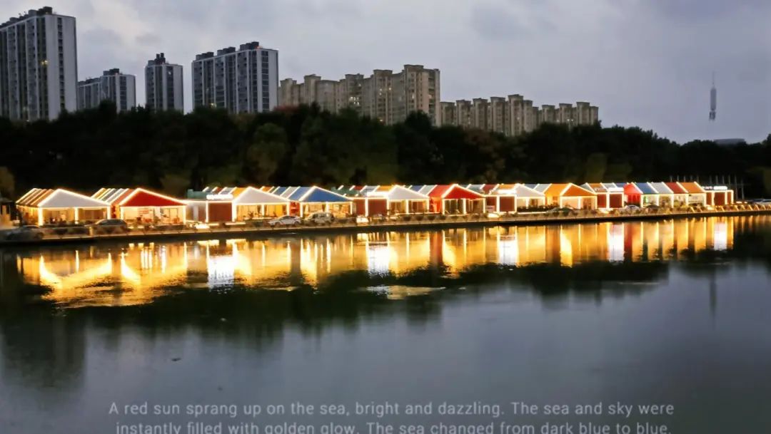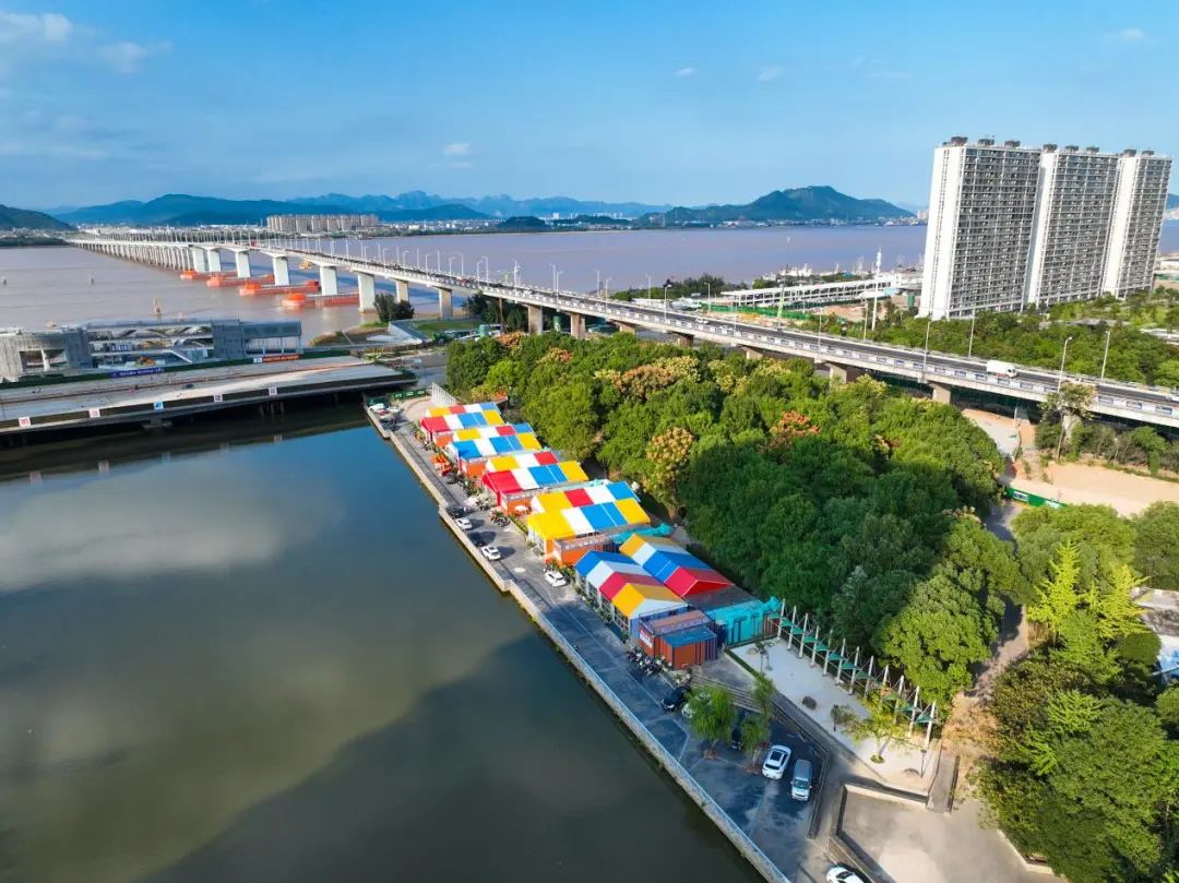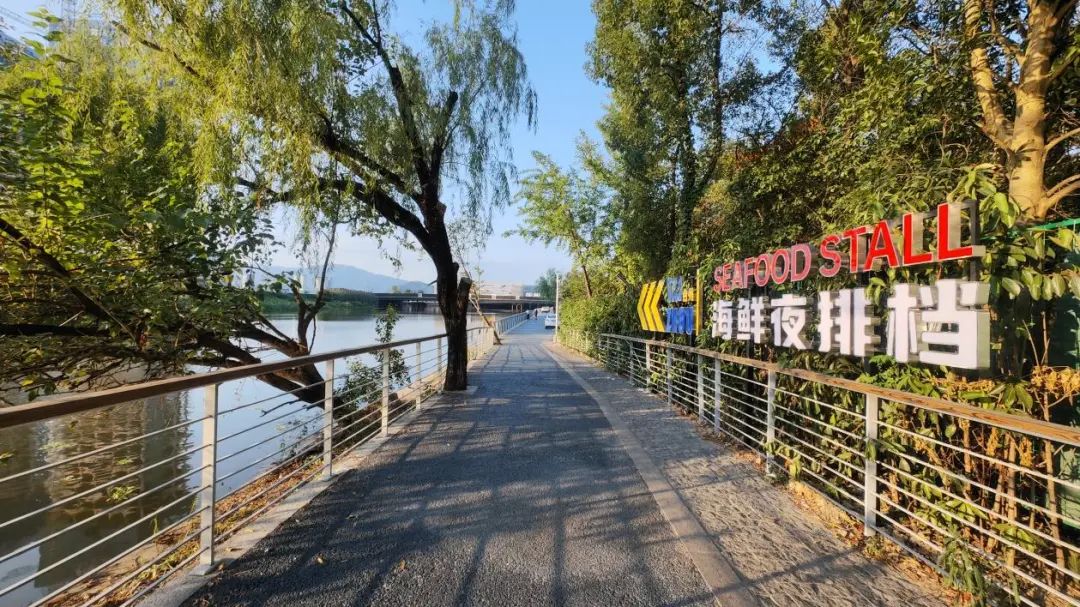 站在工人西路的永宁河桥上,只见两岸绿柳轻拂,右前方有一长排红白蓝黄相间的房子,那就是于9月16日试营业的台州· 海鲜夜排档。在那里吃饭,前面是永宁河,右边是滨江公共空间,后面是椒江大桥公园,美景、美食,还有那排档特有的人间烟火气。