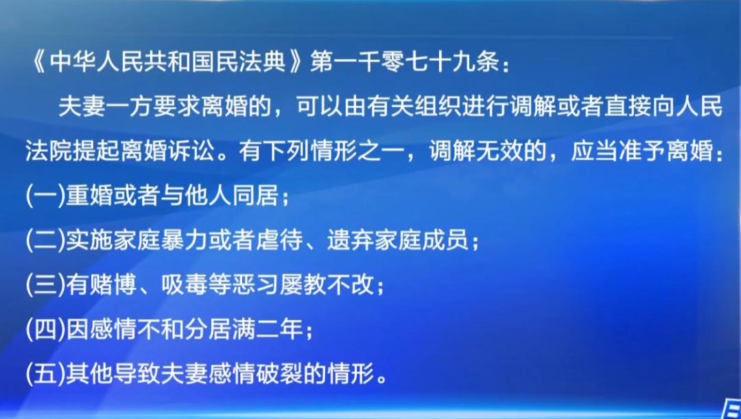 《中华人民共和国民法典》第一千零七十九条:夫妻一方要求离婚的,可以由有关组织进行调解或者直接向人民法院提起离婚诉讼。有下列情形之一,调解无效的,应当准予离婚:(一)重婚或者与他人同居;(二)实施家庭暴力或者虐待、遗弃家庭成员;(三)有赌博、吸毒等恶习屡教不改;(四)因感情不和分居满二年;(五)其他导致夫妻感情破裂的情形。