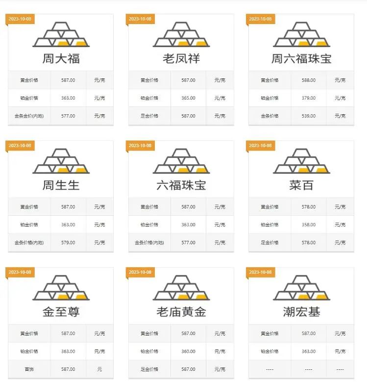10月8日,山东黄金品牌,黄金首饰(Au999)的价格为488元/克“跌价10天左右了,今天(黄金首饰)零售价是587元/克。”周大福品牌门店的销售人员告诉记者,假期前来购买黄金首饰的顾客明显增加,其中,结婚刚需和收藏需要的顾客比较多,金饰和金条的销量都有所增加。