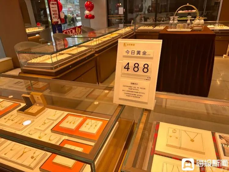 10月8日,海报新闻记者在山东黄金济南泉城路店内看到,今日的黄金首饰(Au999)的价格为488元/克。赛姝告诉记者,该黄金饰品品类的价格比9月份最高点的528元/克降了40元/克,属于降幅较大的品类。