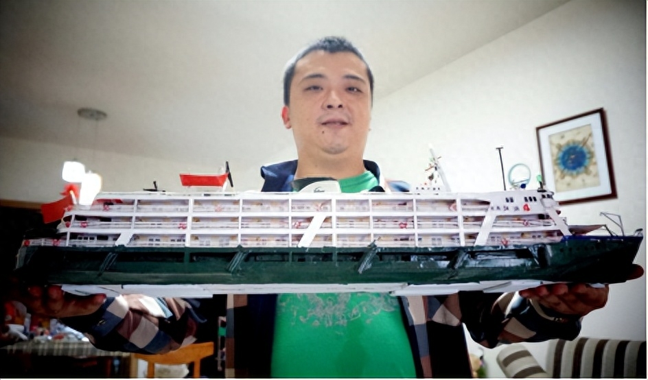 ▲ 长江船舶爱好者王轩和他制作的“江渝4”号客轮模型。此船换色改名后,现收藏于奉节县诗城博物馆