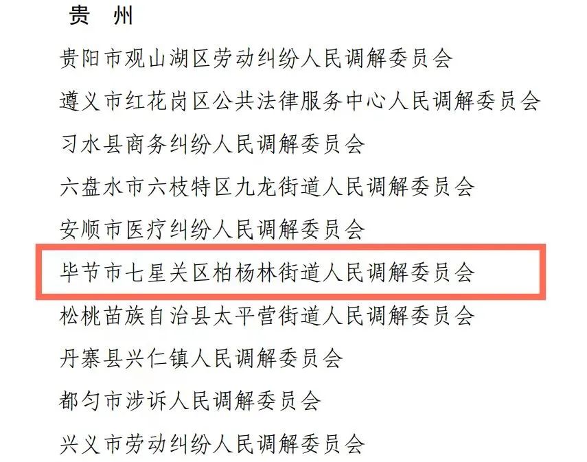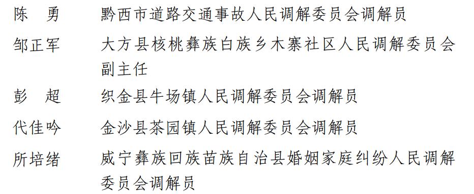 司法部表彰299个全国模范人民调解委员会和999名全国模范人民调解员。其中,毕节市七星关区柏杨林街道人民调解委员会及5名个人受到表彰。
