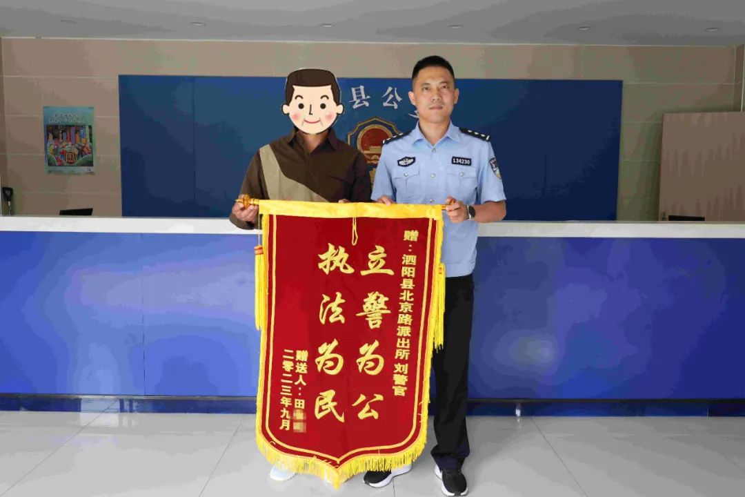 9月6日上午,田先生带着一面印有“立警为公 执法为民”的锦旗来到北京路派出所送至民警刘加成手中,表达了诚挚谢意。