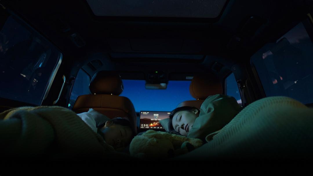 一室:后两排放倒,搭配官方定制床垫,变身 2m × 1.3m 大床卧室。