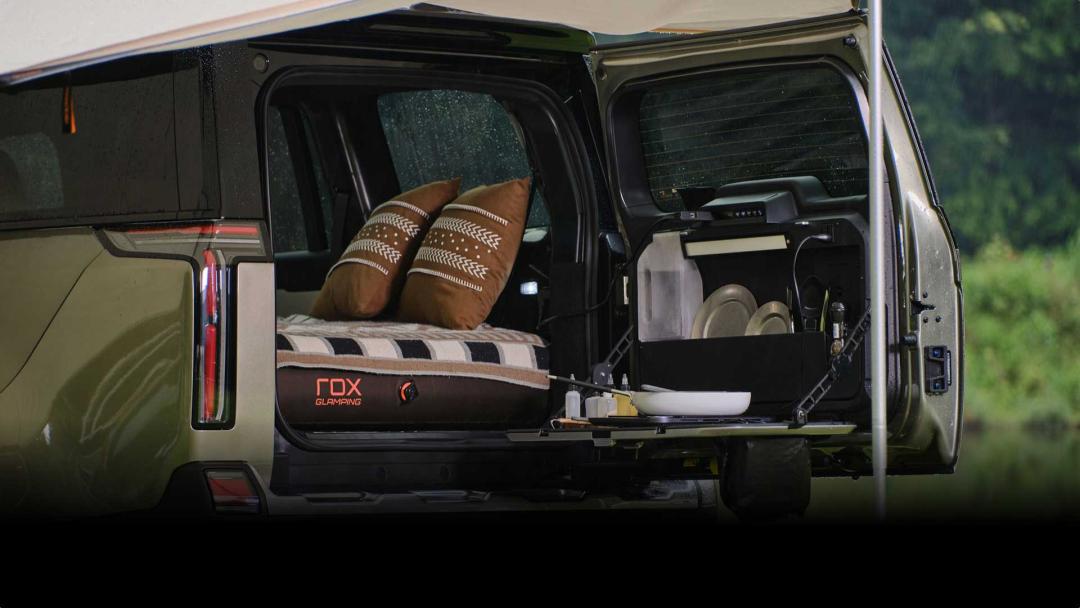 一厨:官方定制车尾餐厨系统,打开尾门就是小厨房。餐具、厨具,操作台、小桌板一应俱全, 2.2 千瓦对外放电也刚好够接电磁炉,还自带即热饮水机随时供应热水。
