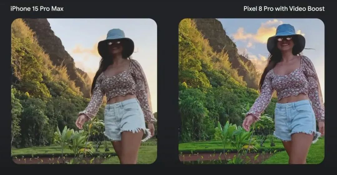你看谷歌 Pixel 8 和 8 Pro 明明用了同款芯片,但是 8 Pro 却独占了一项 VideoBoost 功能,视频经过云端处理可以有效提升画质。