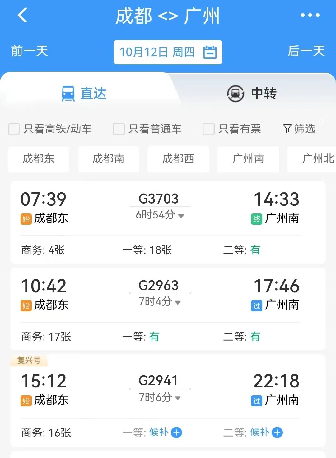 成都东至广州南最快6小时54分