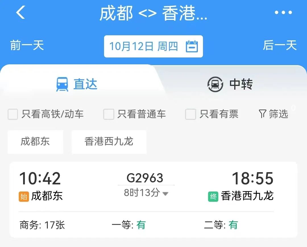 G2963次成都东10:42开、香港西九龙18:55到,运行时间8小时13分,较之前减少1小时54分,停站8个,较之前减少2个。