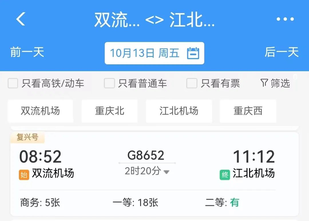 成都双流机场前往重庆江北机场方向:车次为G8652,该趟列车于8时52分从双流机场出发,途经成都东、内江北、重庆北,最终于11时12分到达江北机场,全程耗时2小时20分,二等座、一等座、商务座价格分别为175元、282元、574元。
