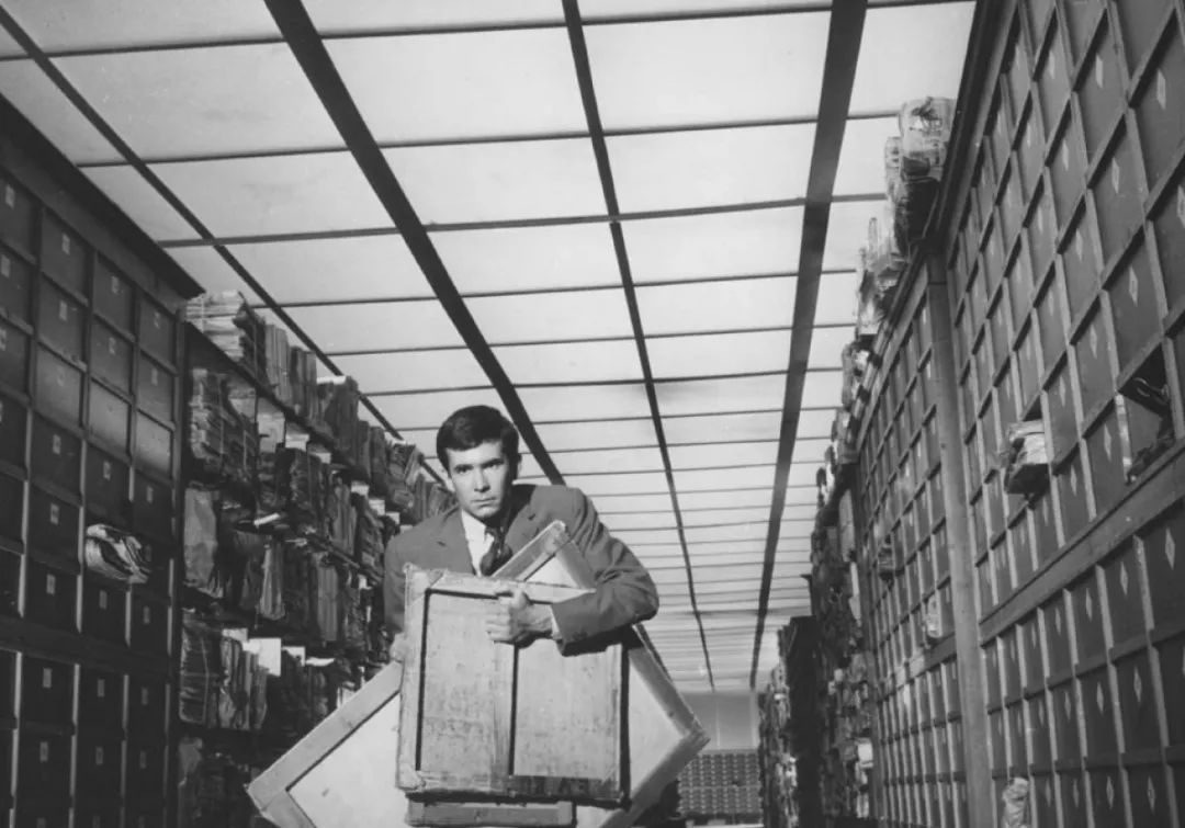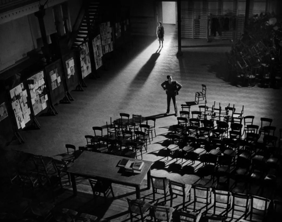 《审判》(1962)剧照书中还有一组不十分确定的信息,但按常理可推出下面的可能性:K上的楼梯是离街道最近的一个楼梯;他跑遍二楼,说明他极可能回到同一个楼梯;上去六层,下来,再上六层,均为此梯;审讯庭为楼梯旁第一个房间,因此审讯庭在临街的一个楼角里。因此当K在街上行走时,预审法官是完全可能从某个窗口探出头来看到他;卡夫卡下意识地暴露了他为审讯庭安排的临街位置,也许?