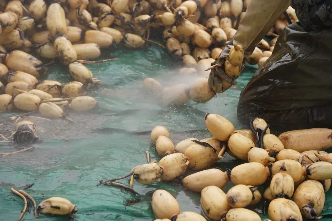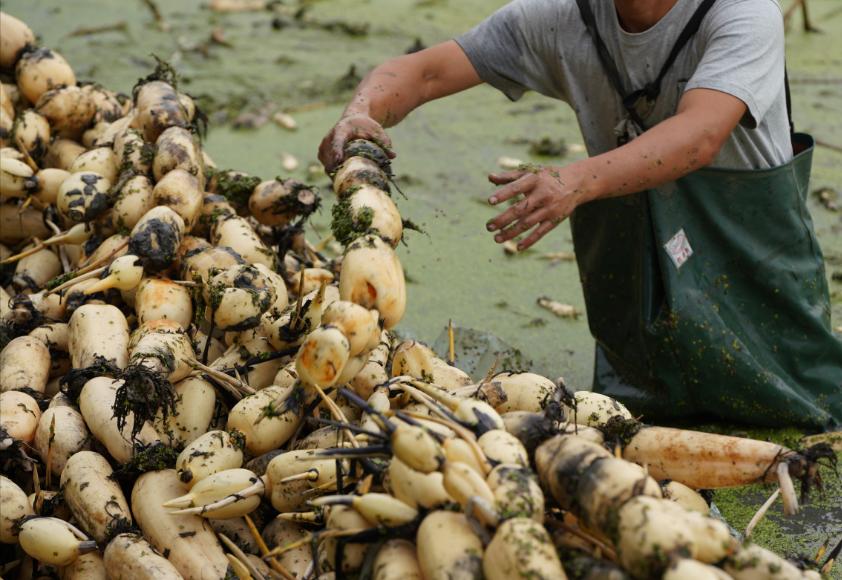 荷莲一身宝,秋藕最养人。当下的练塘莲藕,含水量足、清甜鲜嫩,不仅具有美味的口感,还富含铁、钙等微量元素及蛋白质、粗纤维、矿物质等营养成分。一根根新鲜“出炉”的莲藕,是长在江南人味蕾上的“水八仙”之一,白白胖胖,像一个个胖娃娃,让人爱不释手。掰开一刻,千丝万缕,清香四溢,令人垂涎欲滴。