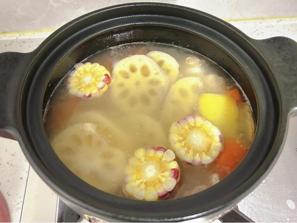 3、炖锅里加入清水,放进排骨、玉米段、莲藕块、胡萝卜块、红枣、姜片,大火开煮。