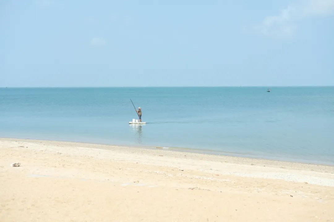 第二天,天微亮,还能看到天空的那颗启明星,却早有渔民扛着渔网出海。天亮后,偶遇一渔民在海边挖螺,还告诉好奇的游客如何辨识螺的位置及挖螺技巧。