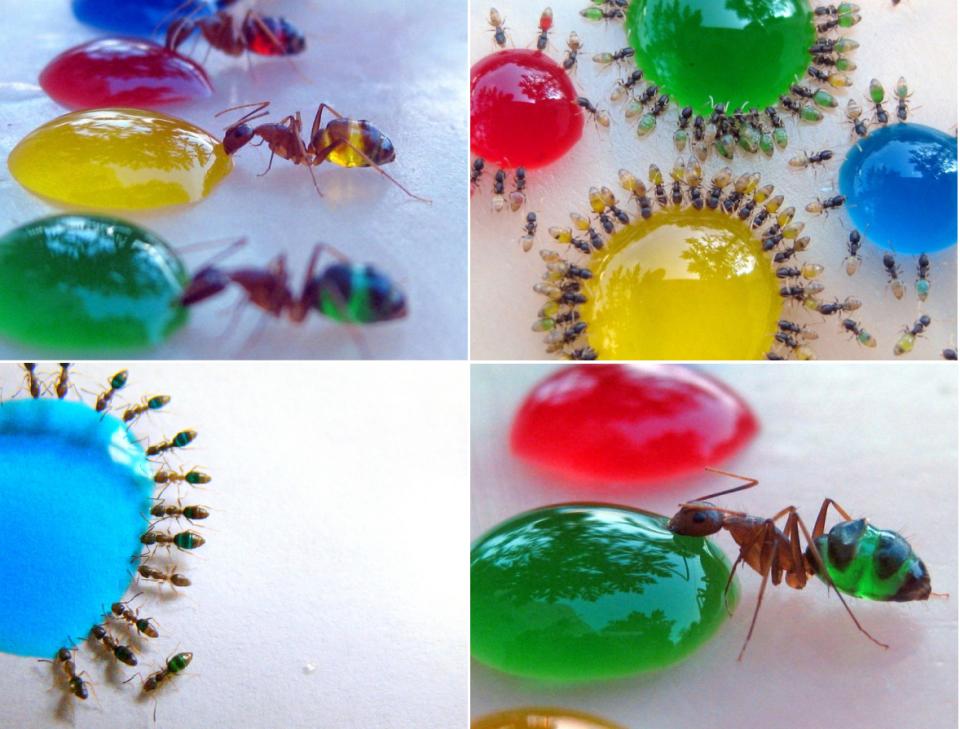 深棕色,表明食物糖分比较高,浅棕色,表明水分含量高,有研究表明有的蜜罐蚁只用来储存水分;绿色黑色,表明采集到的食物含有自己的颜色;