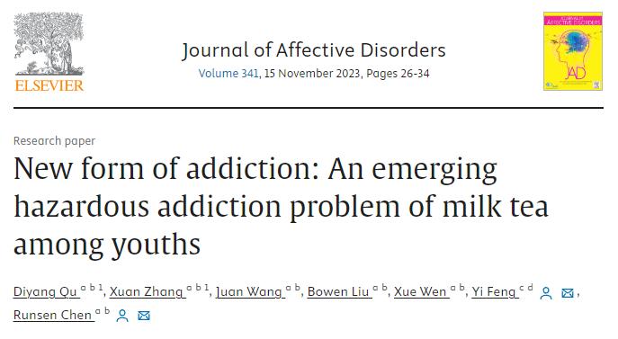 近日,清华大学、中央财经大学的研究人员发表在《情感障碍杂志》(Journal of Affective Disorders)上的研究显示,喝奶茶可能会导致成瘾,并且与抑郁、焦虑和自杀意念有关。