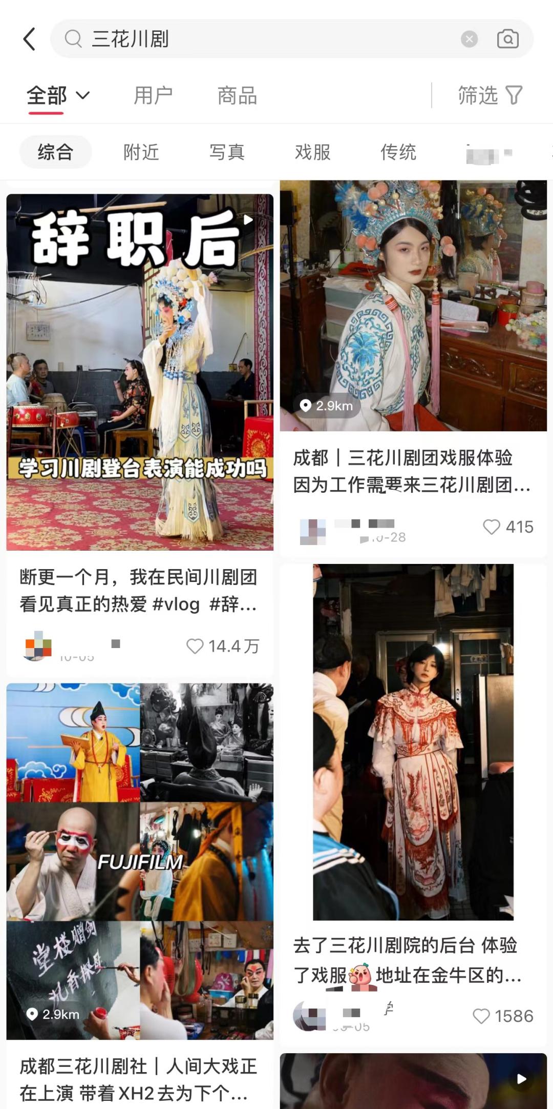 每天,账号都发出了川剧团的明日演出剧目,还涵盖戏装体验。不到一个月,李龙就感受到“火”了,越来越多的大学生来看戏,甚至还有网红赶来,“人流量比较大,我们的川剧文化还是要年轻人了解才行。”在小红书上,很多网友称三花为“宝藏川剧团”,朴实的演员、铁粉老戏迷、“守艺人”……三花成为了网友心中“成都最接地气的川剧团”。截至目前,三花川剧团粉丝接近3000人。