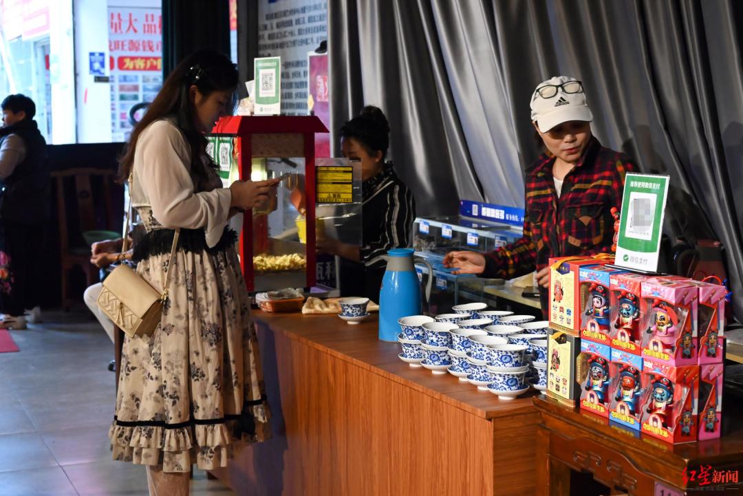 在三花川剧团里,也有一些改变。传统爆米花、盖碗茶旁增加了川剧变脸玩具,扫码就可以购买。一杯10元的盖碗茶,如果通过手机抖音渠道下单,只需要8块8。