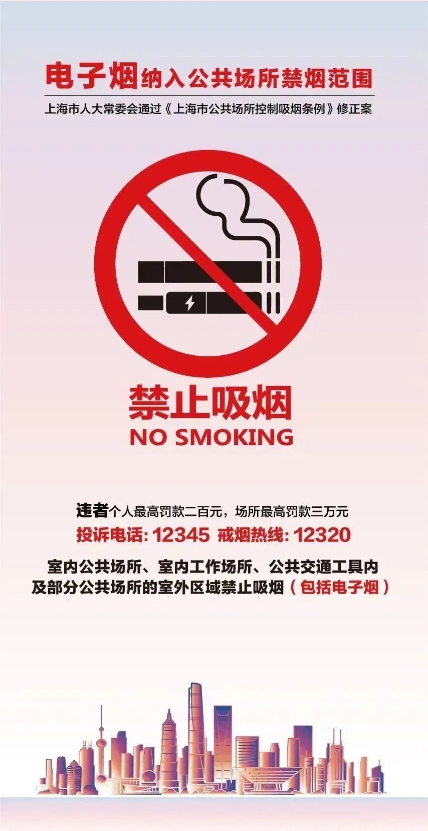 《上海市公共场所控制吸烟条例》规定,室内公共场所、室内工作场所、公共交通工具内已全面禁烟(包括电子烟)。此外,体育场馆、演出场所的观众席以及比赛、演出区域等室外区域也同样属于禁止吸烟区域。违反规定者将面临个人最高罚款200元,场所最高罚款30000元的处罚。(点击链接了解更多详情)划重点:体育场的所有室内区域以及体育场露天看台和内场、演出区域都是全面禁烟的哦,而且也包括电子烟!