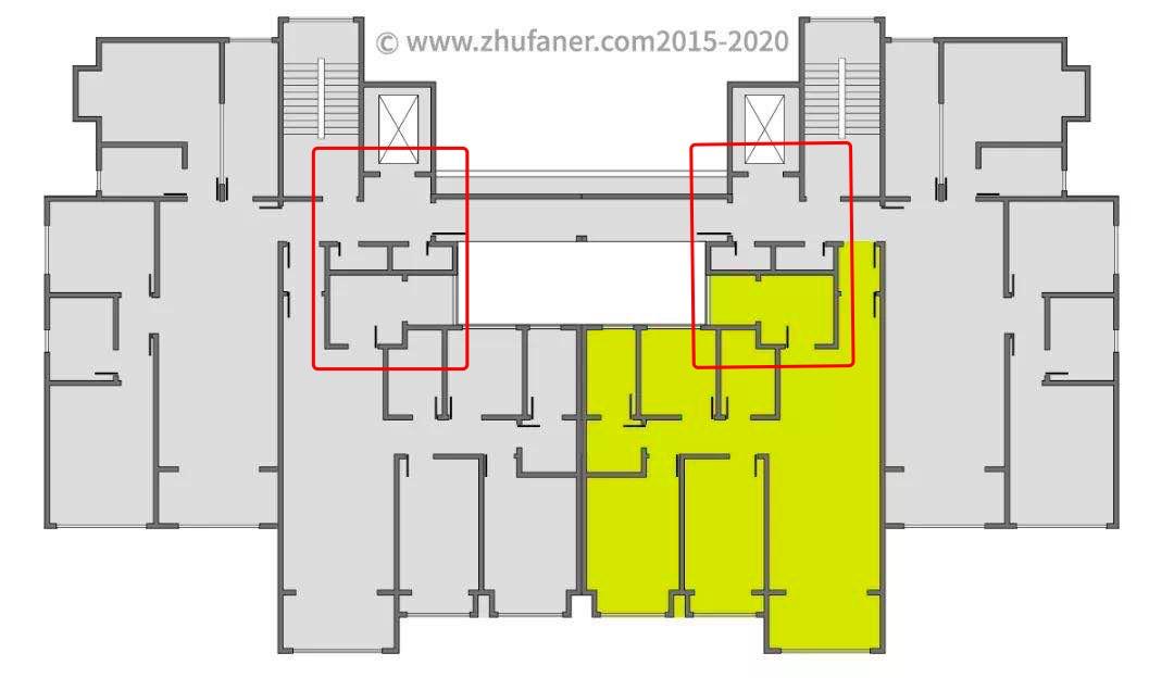 先看一张楼层平面图,我们来直面一下中间户的缺点: