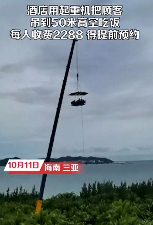 近日,海南三亚一家酒店推出空中餐厅,用起重机将顾客吊到50米高空用餐,此事引发网友热议