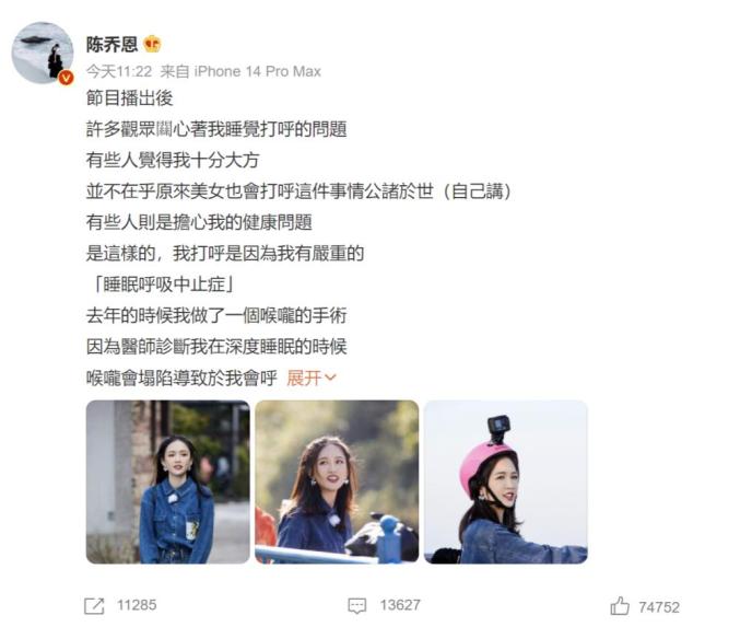 此前,女星陈乔恩也曾因睡觉打鼾登上热搜。陈乔恩表示自己患有严重的睡眠呼吸中止症,如果是深度睡眠的话,一个小时会中止呼吸25次,每次长达50秒以上,因而不得不做手术。