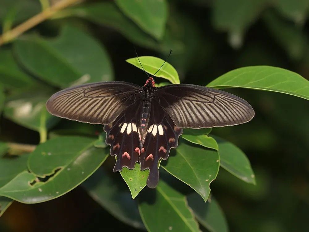 大型蝴蝶,身体为红色,翅膀为黑褐色,后翅有7个红色圆斑以及2-3个小白斑。红珠凤蝶飞行缓慢而优雅,喜欢访花吸蜜,市区公园绿地,甚至小区里都可见到它们的舞姿。11月之前可见。青凤蝶