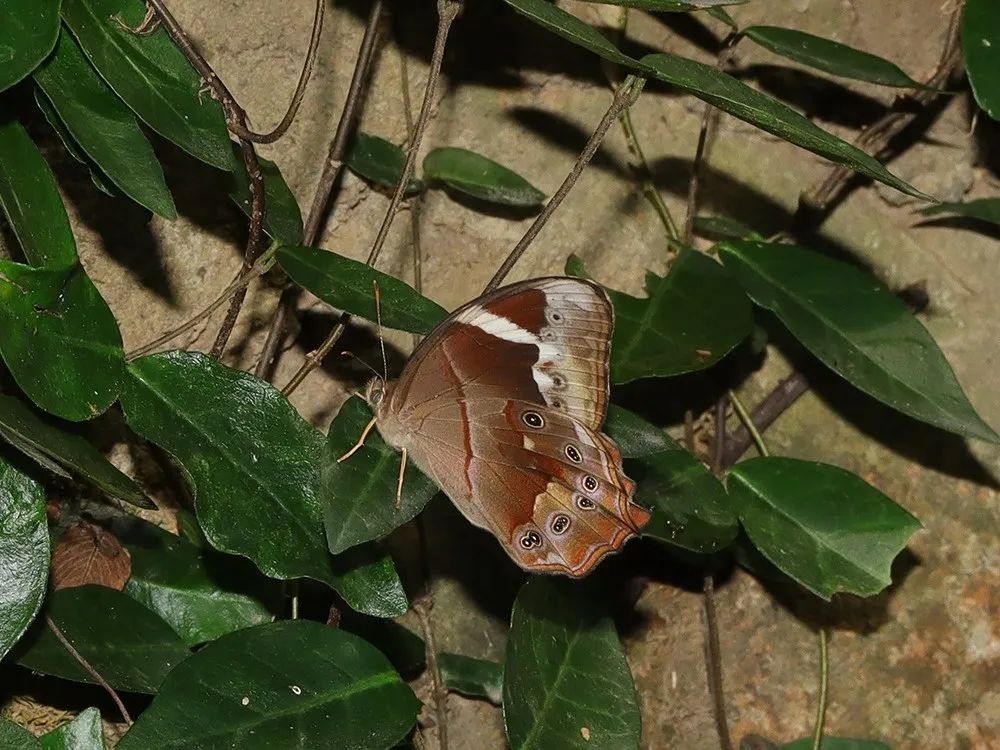 中型蝴蝶,翅膀白色并有发达的黑色脉纹,后翅末端还有红斑。黑脉蛱蝶飞行优雅,时常飘飘然,喜欢停栖在树林附近的地面或树叶上,全上海都能见到它们,秋季也是观察它们的好时机。11月之前可见。曲纹黛眼蝶